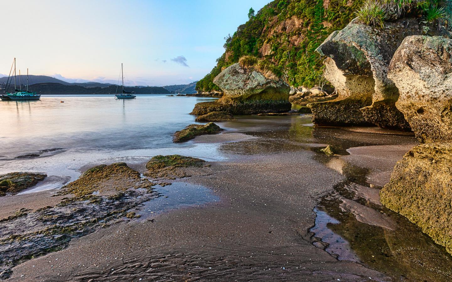 Wallpaper Wet sand and large boulders by the bay