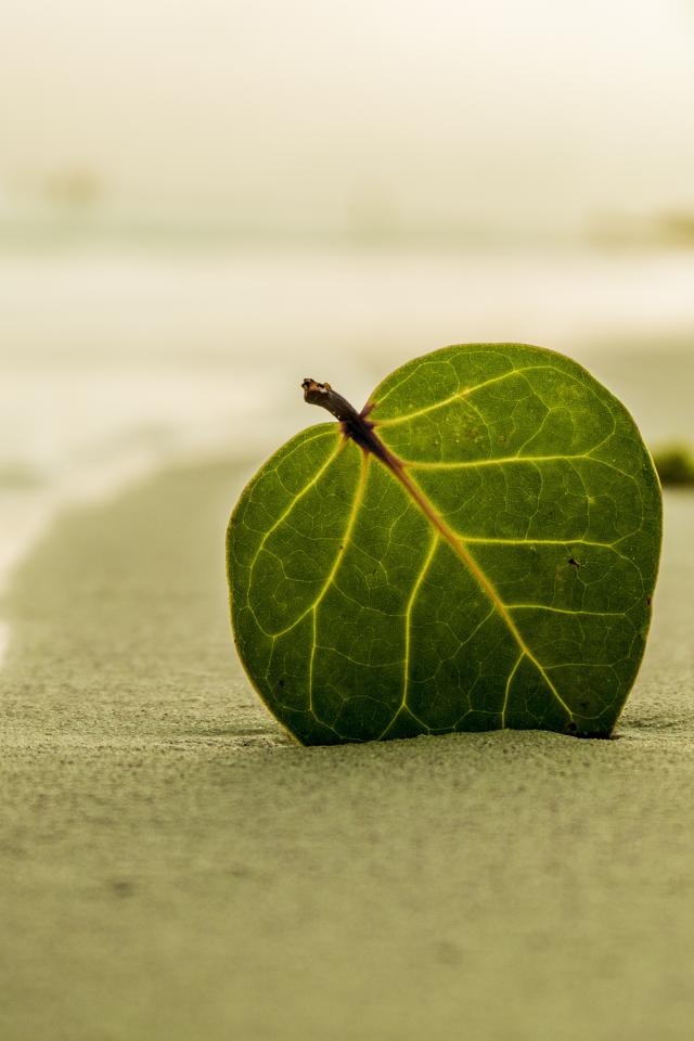 Wallpaper Green leaf on yellow sand by the sea