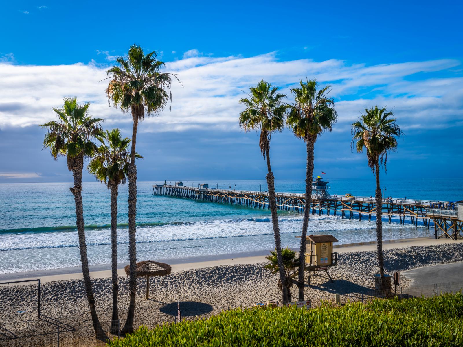 Wallpaper Tall palm trees on the ocean by the bridge