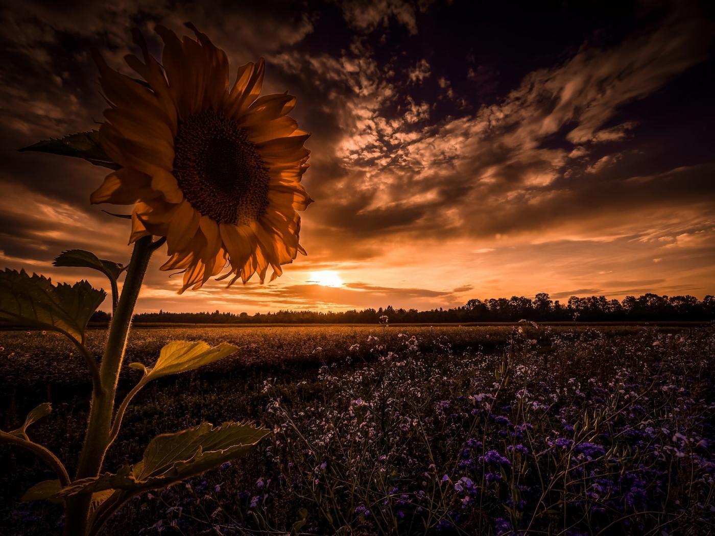 Wallpaper Sunflower in a field with blue flowers against the sky