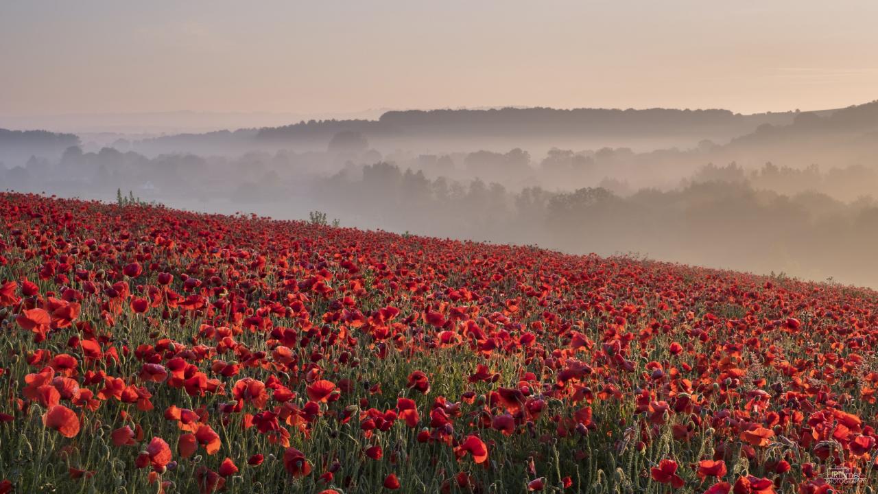 Wallpaper Field of red poppies in the morning fog