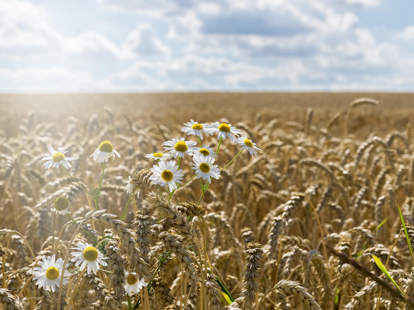 Wallpaper Camomiles grow on the field of yellow wheat
