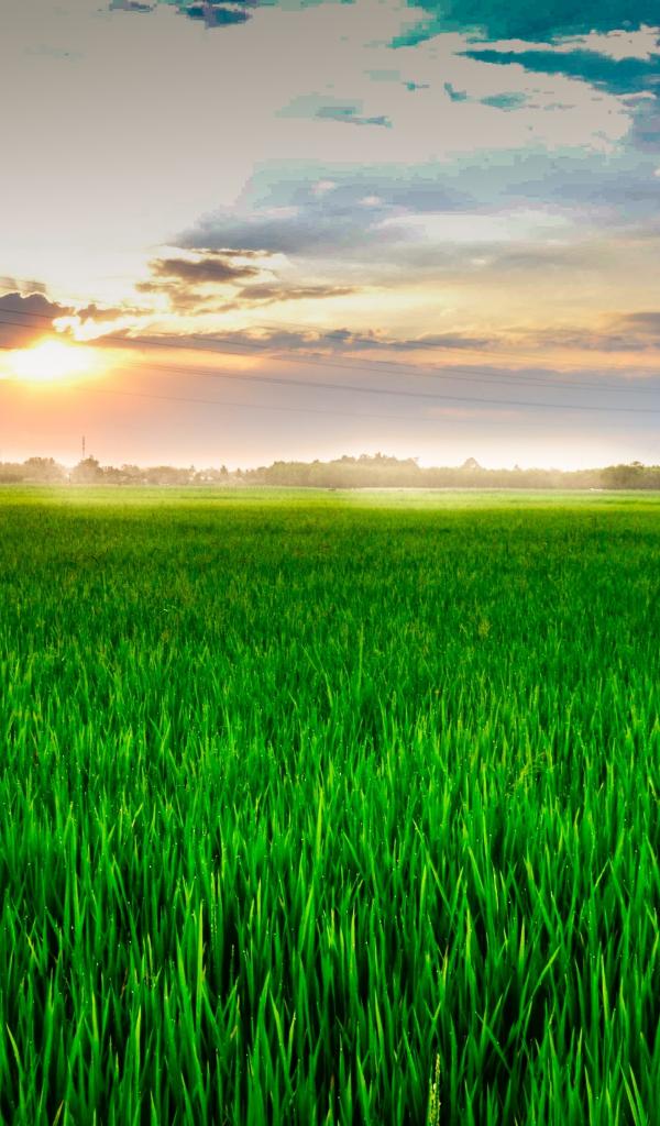 Wallpaper Sunrise of summer sun over field with green wheat