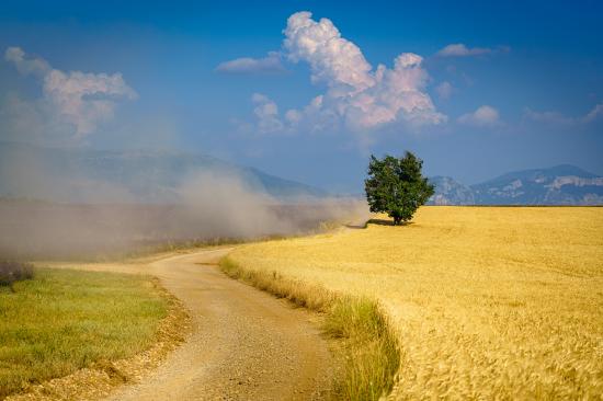 Wallpaper Dusty road near a field with wheat under a blue sky