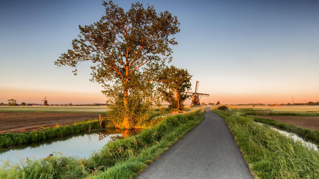 Wallpaper Field and mill by the road at sunrise