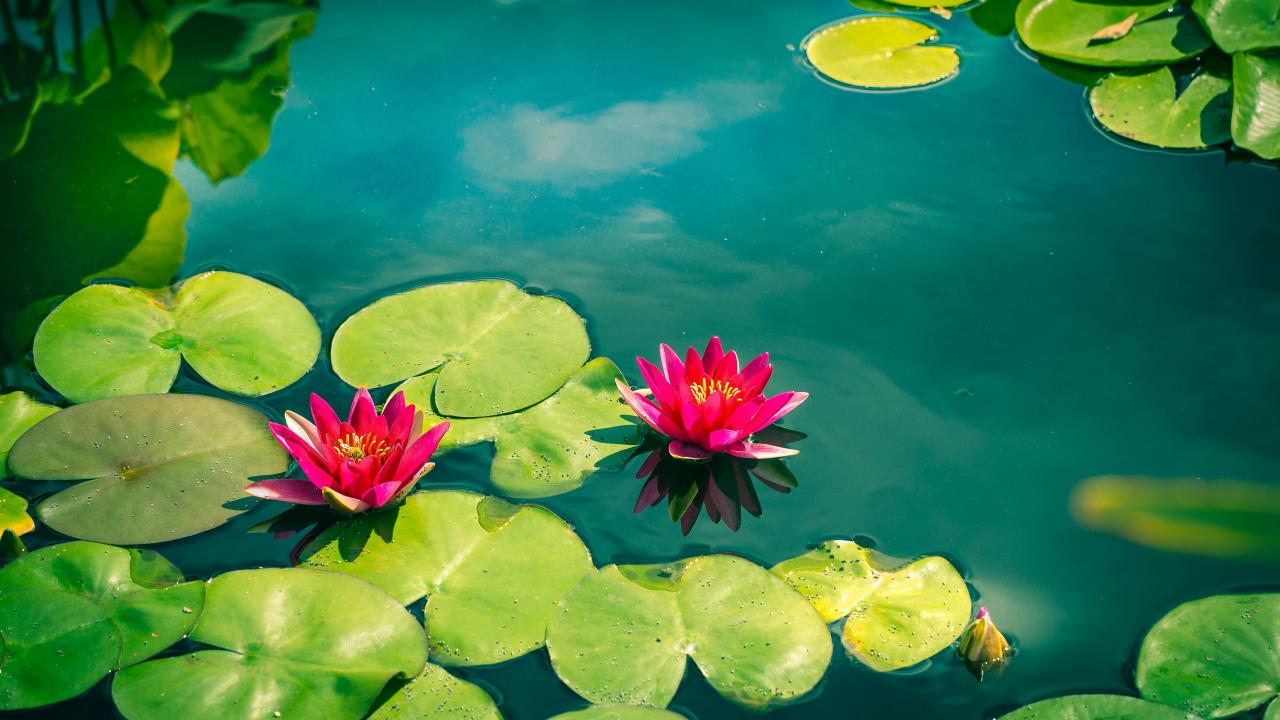 Wallpaper Fantastic water lilies in the water under a blue sky