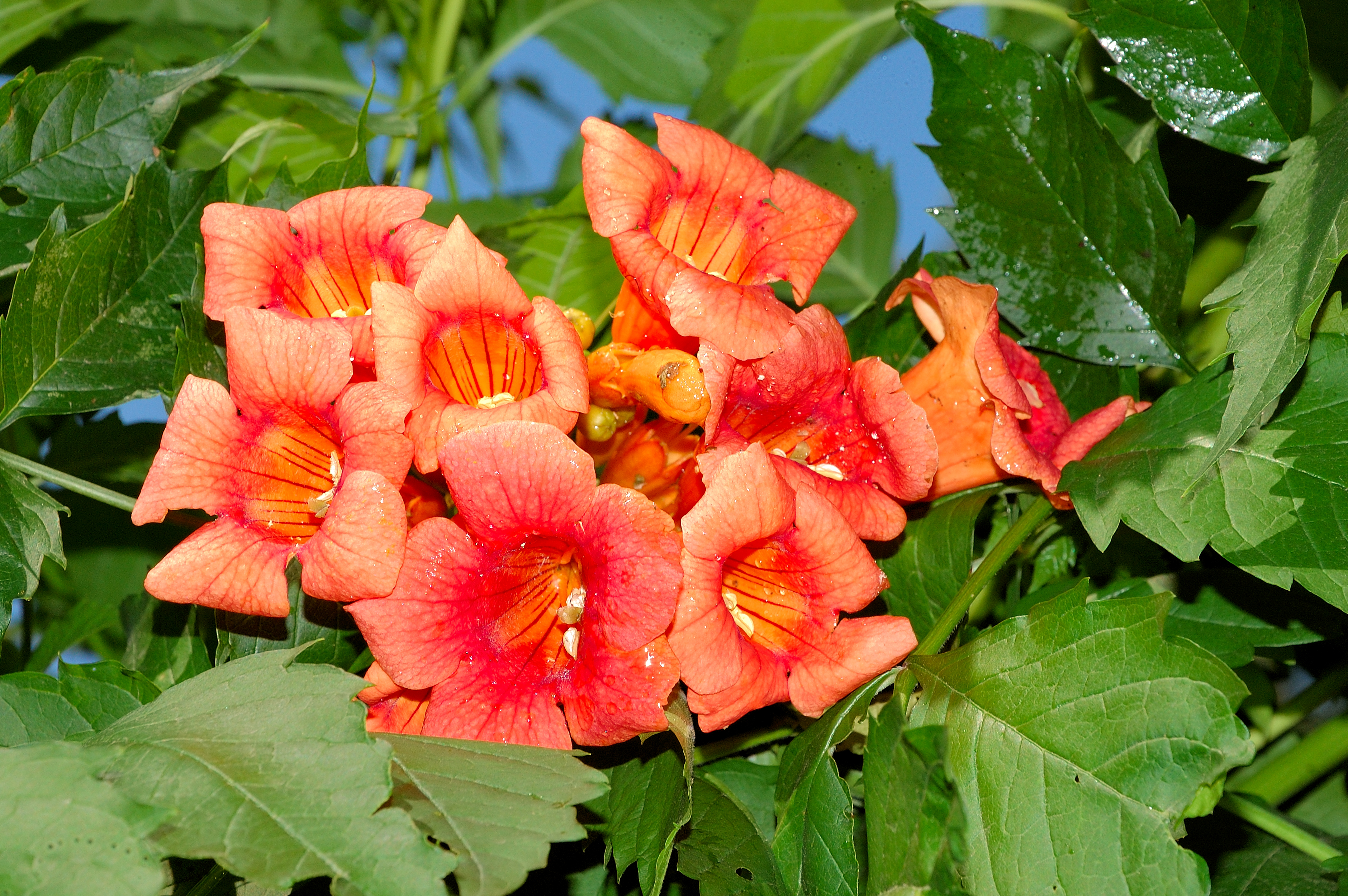 Wallpaper Beautiful orange flowers kampsis on a blue background