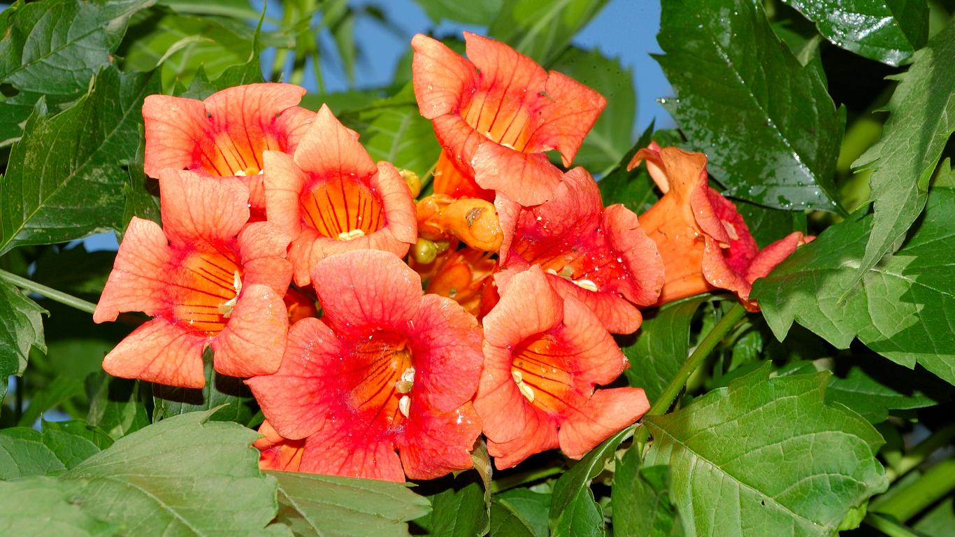 Wallpaper Beautiful orange flowers kampsis on a blue background