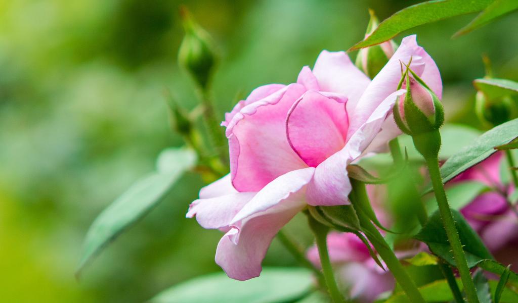 Wallpaper Pink flower of a rose with buds in drops of dew