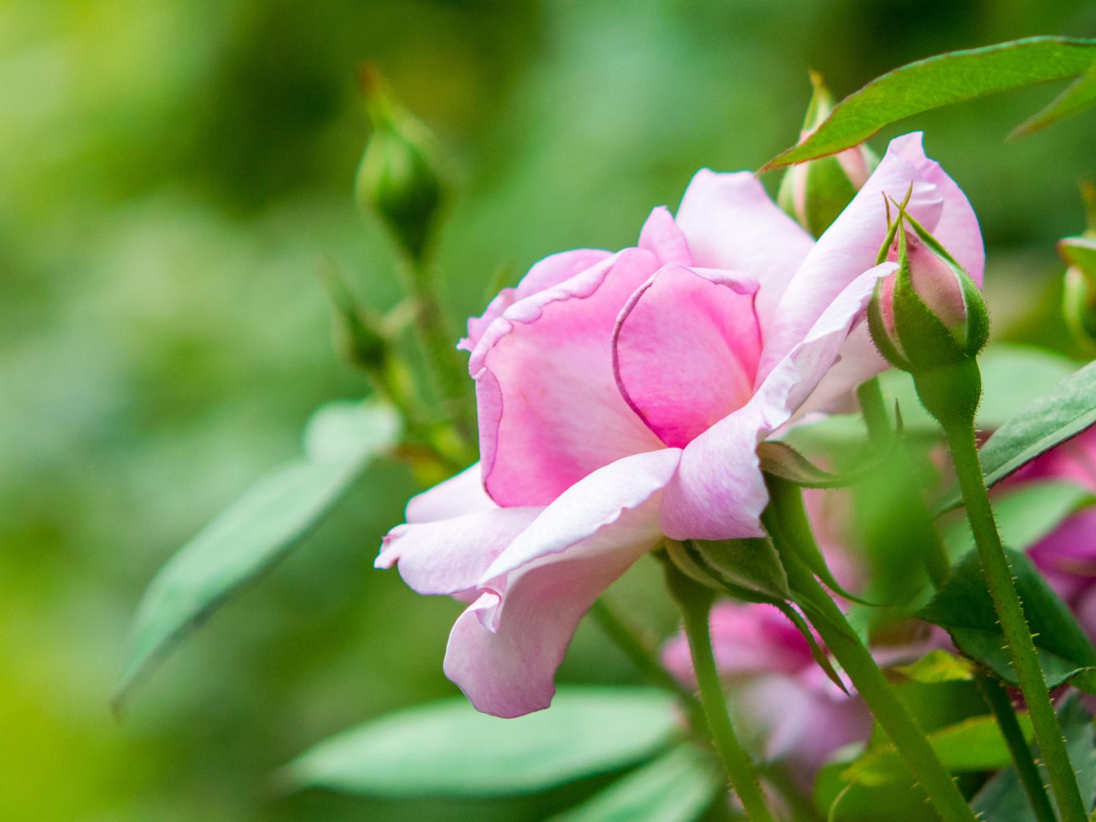 Wallpaper Pink flower of a rose with buds in drops of dew