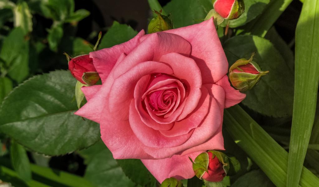 Wallpaper Pink rose with buds on the flower bed