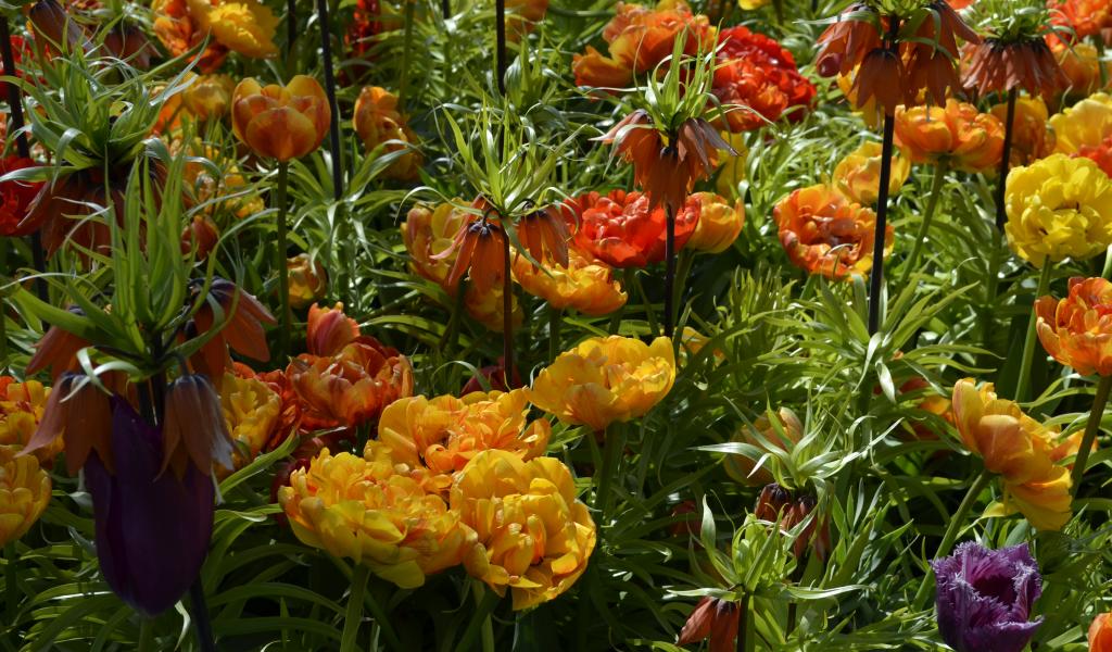 Wallpaper Beautiful tulips and hazel grouses on the flower bed closeup