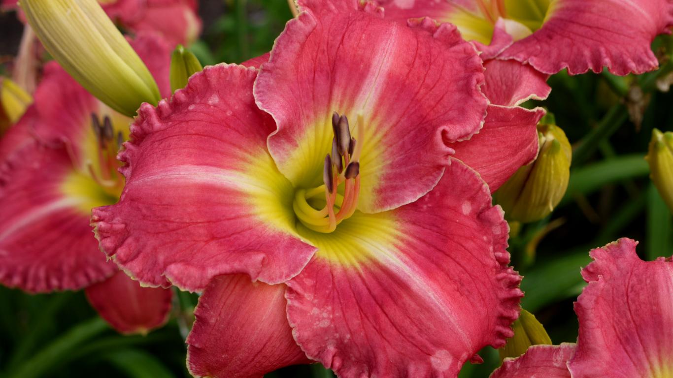 Wallpaper Delicate pink lily with buds on a green background close-up