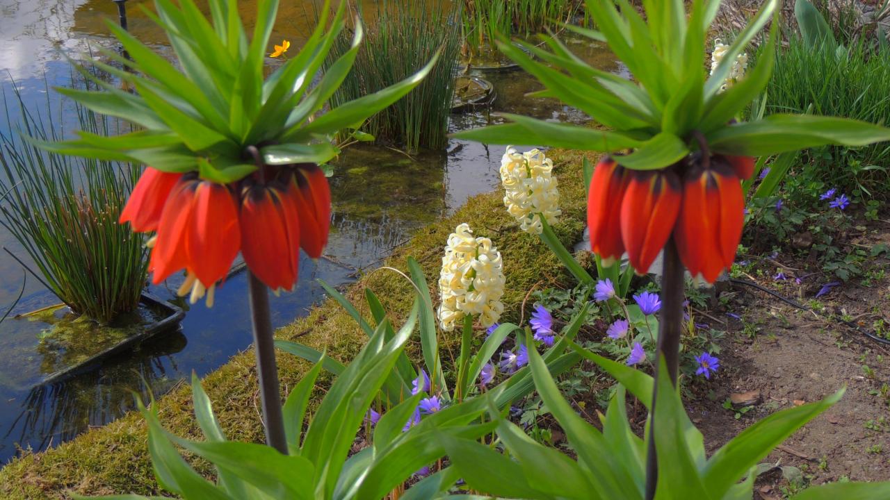 Wallpaper Flowers of hazel grouses and hyacinths near the pond