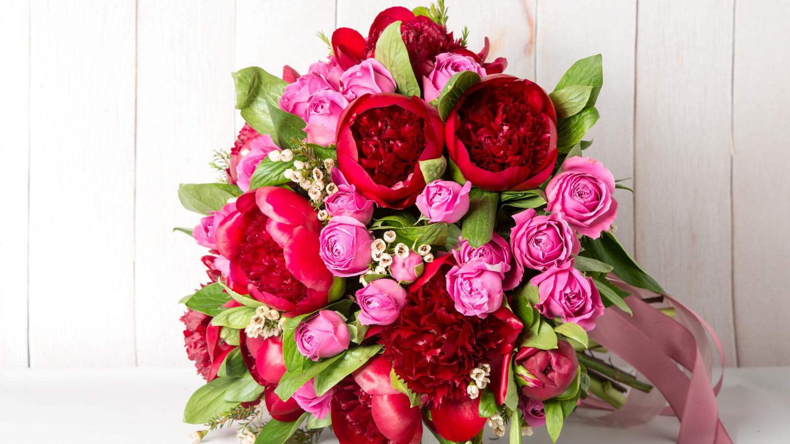 Wallpaper Beautiful bouquet of pink roses with red tulips