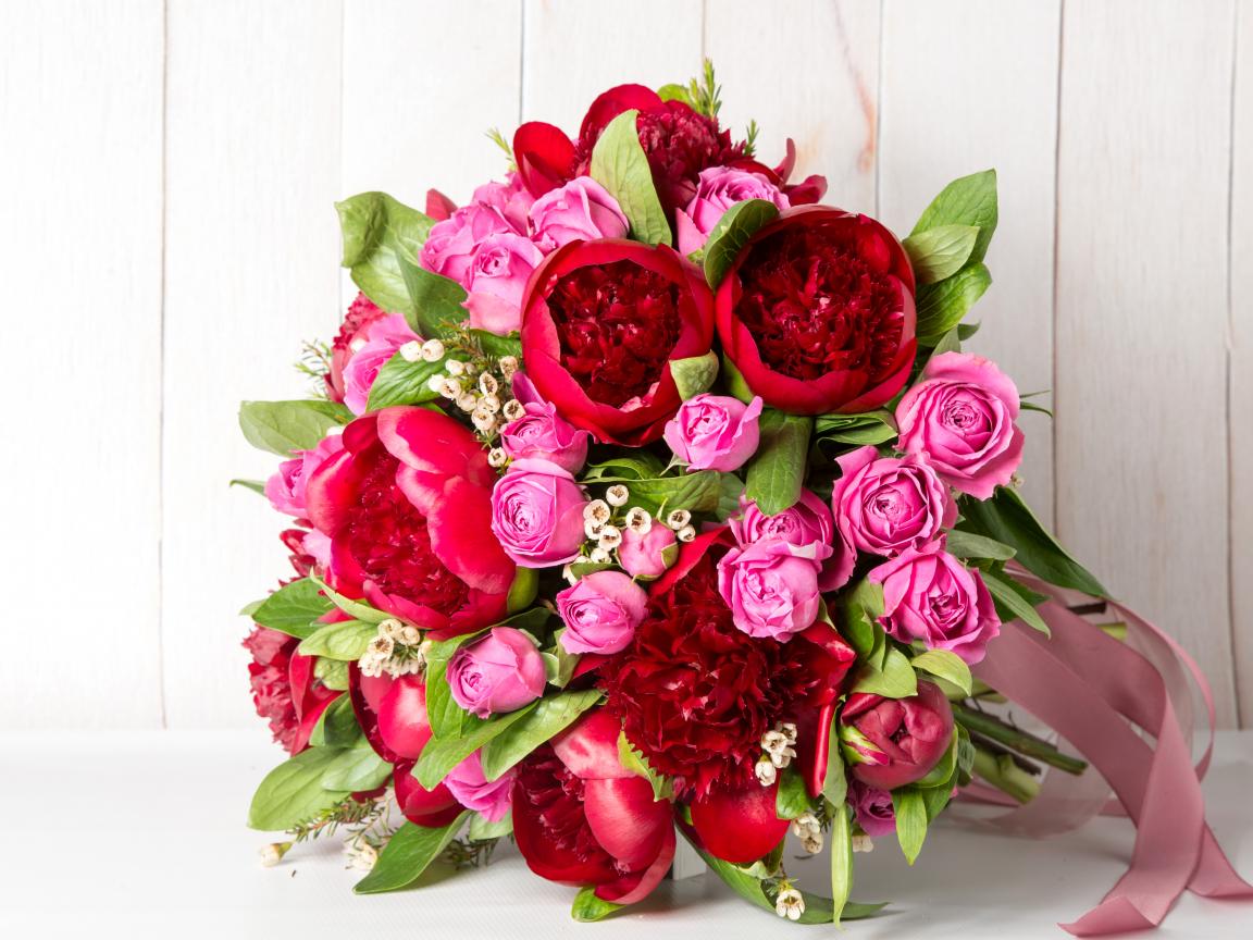 Wallpaper Beautiful bouquet of pink roses with red tulips
