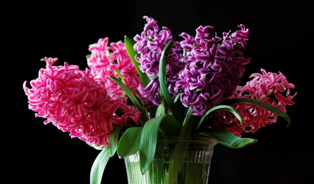 Wallpaper Multi-colored hyacinths in a vase on a black background