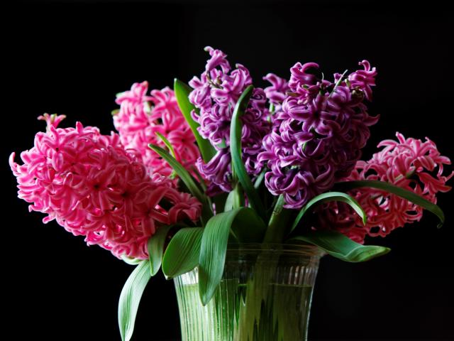 Wallpaper Multi-colored hyacinths in a vase on a black background