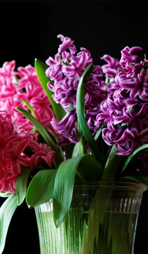 Wallpaper Multi-colored hyacinths in a vase on a black background