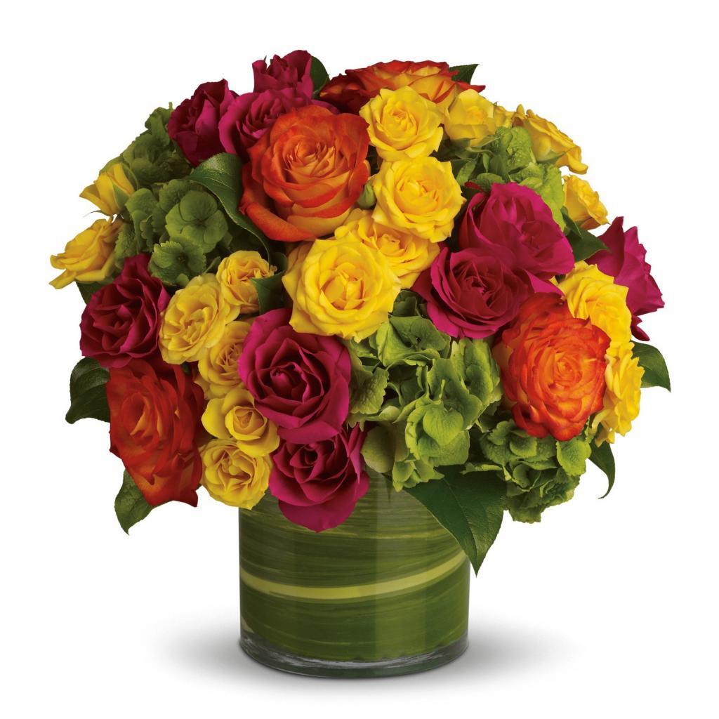 » Wallpaper Bouquet of multicolored roses in a vase on a white background