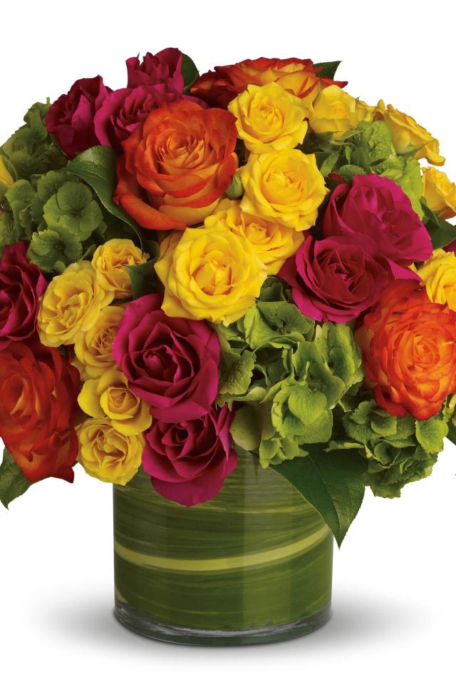 Wallpaper Bouquet of multicolored roses in a vase on a white background