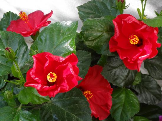 Wallpaper Red hibiscus flowers with green leaves close-up