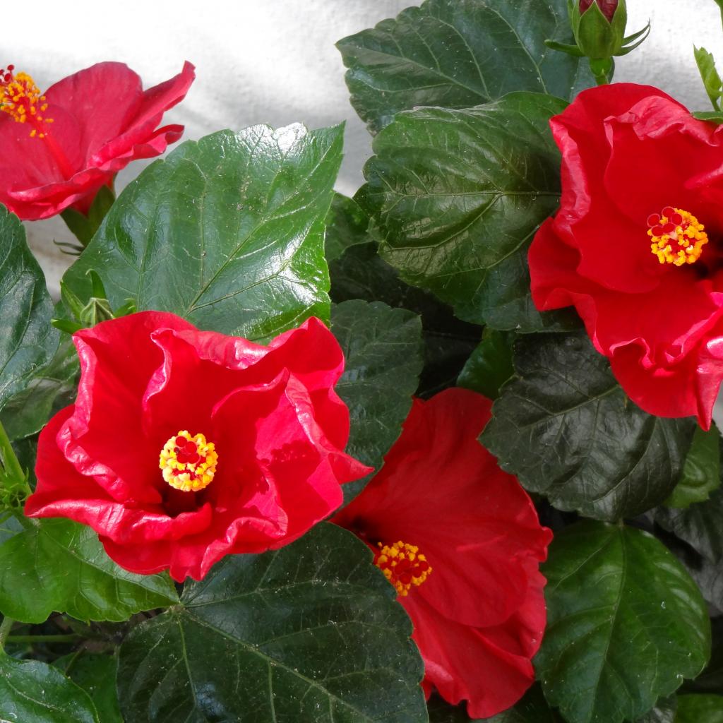 Wallpaper Red hibiscus flowers with green leaves close-up