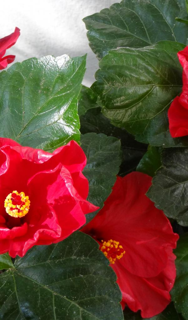 Wallpaper Red hibiscus flowers with green leaves close-up