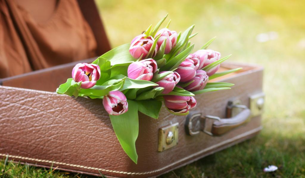 Wallpaper Bouquet of pink tulips in a leather suitcase