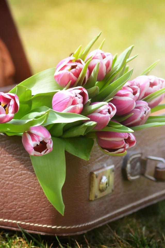 Wallpaper Bouquet of pink tulips in a leather suitcase