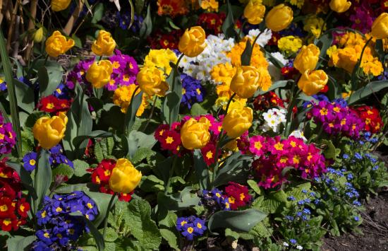 Wallpaper Multicolored flowers of primrose and tulips on a flower bed