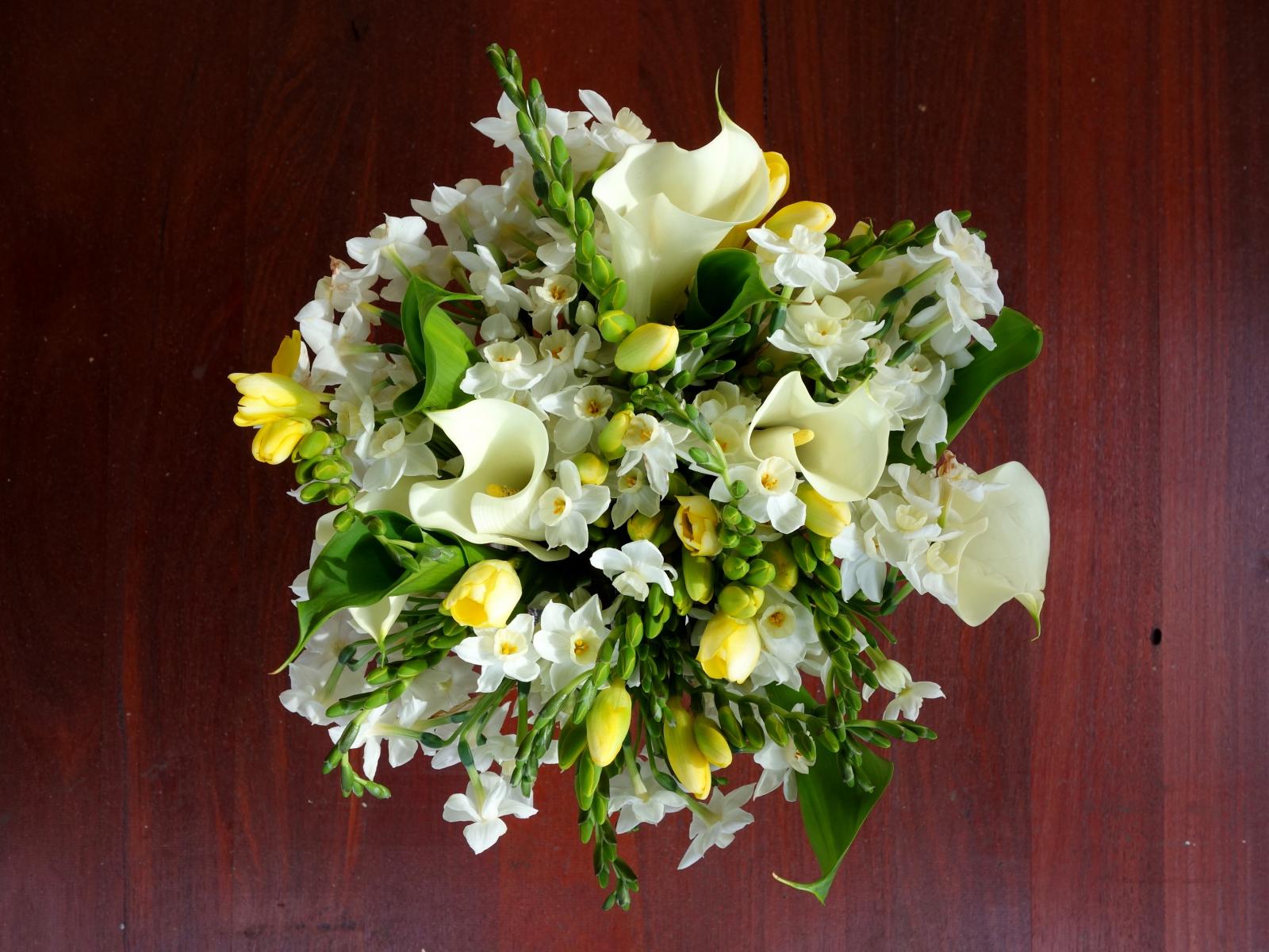 Wallpaper Delicate white daffodils and callas in a beautiful bouquet