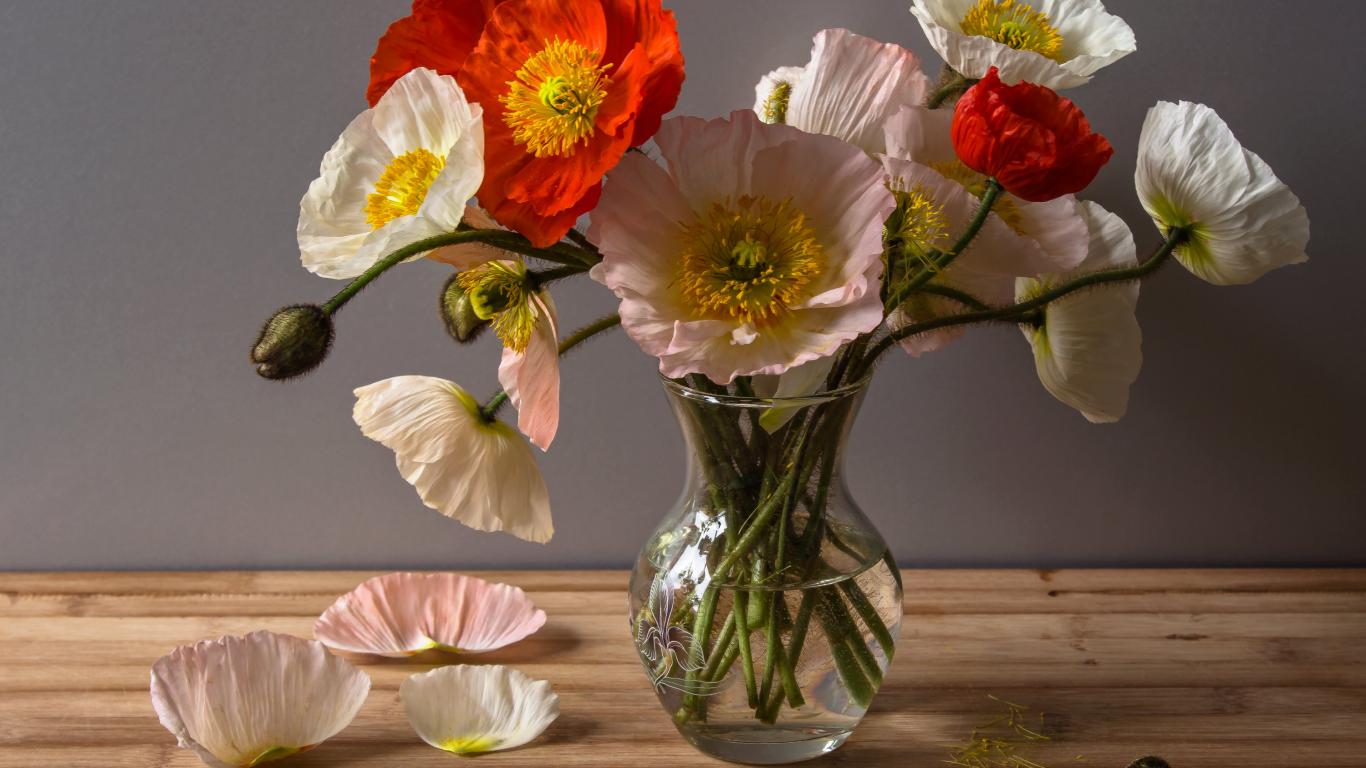 » Wallpaper A bouquet of large beautiful poppies in a transparent vase