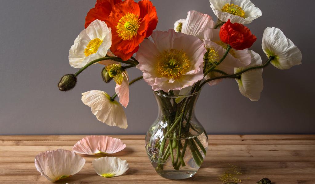 » Wallpaper A bouquet of large beautiful poppies in a transparent vase