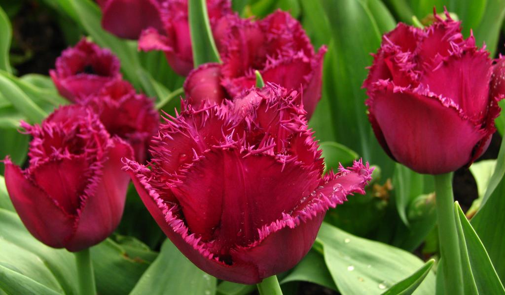 » Wallpaper Bordovye tulips on a flower bed in drops of water close-up