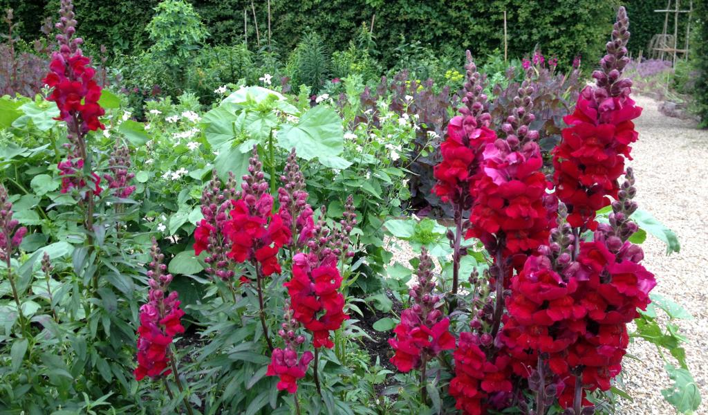 Wallpaper Beautiful burgundy flowers of a snapdragon on a flower bed