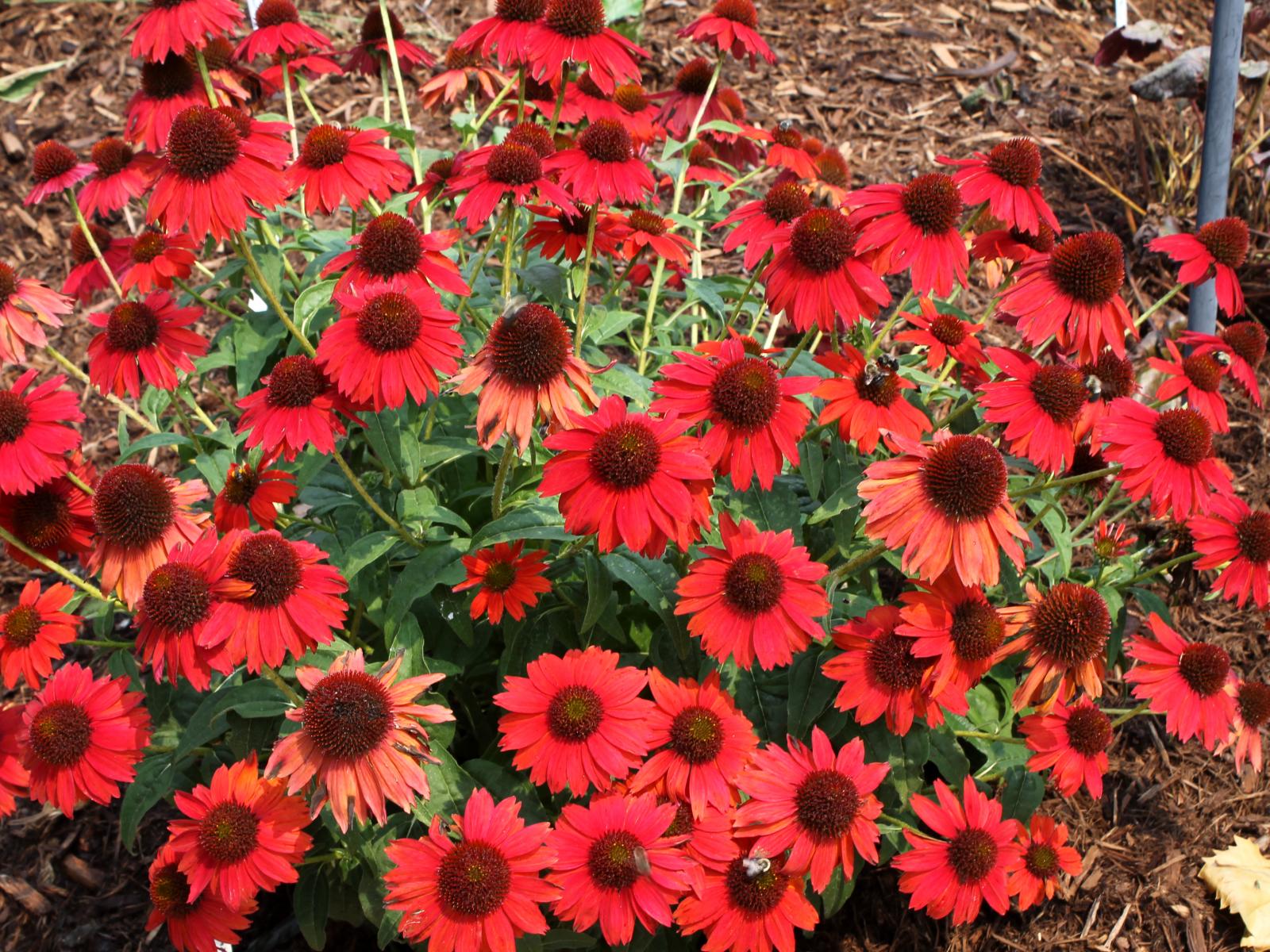 Wallpaper A bush of red flowers of echinacea on the flowerbed