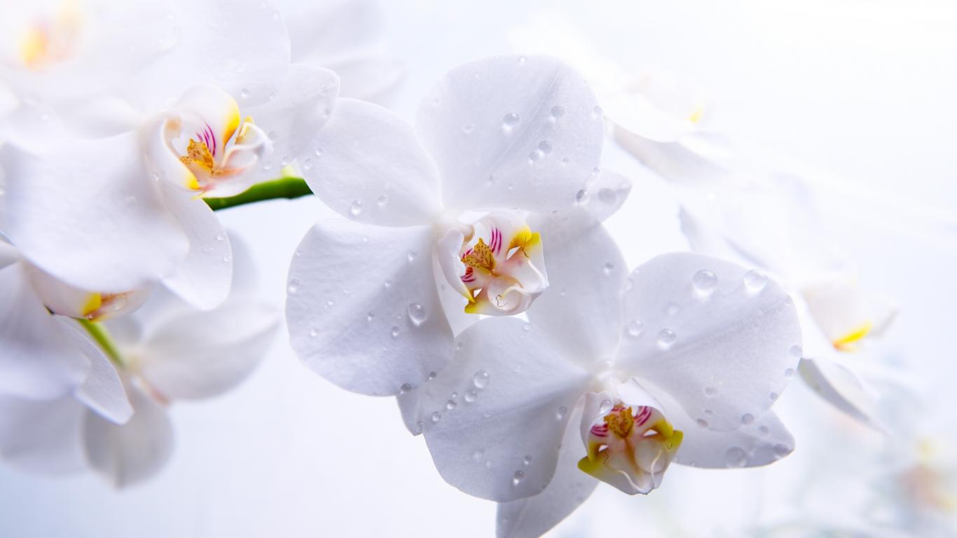 Wallpaper Delicate white orchid in droplets of water closeup