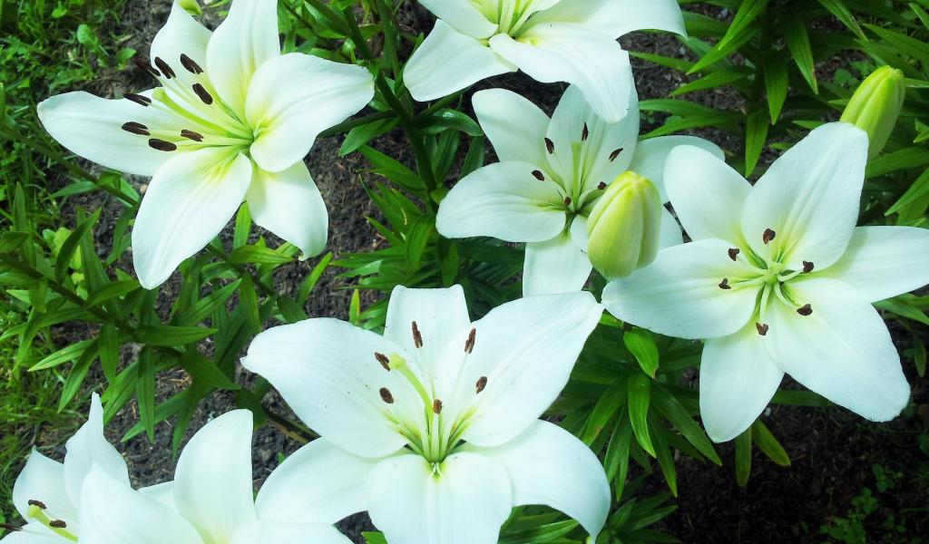 Wallpaper Delicate white lilies on a flower bed closeup