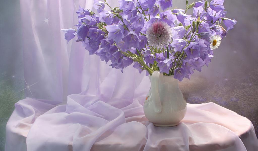 Wallpaper A bouquet of purple bells in a white vase on a table