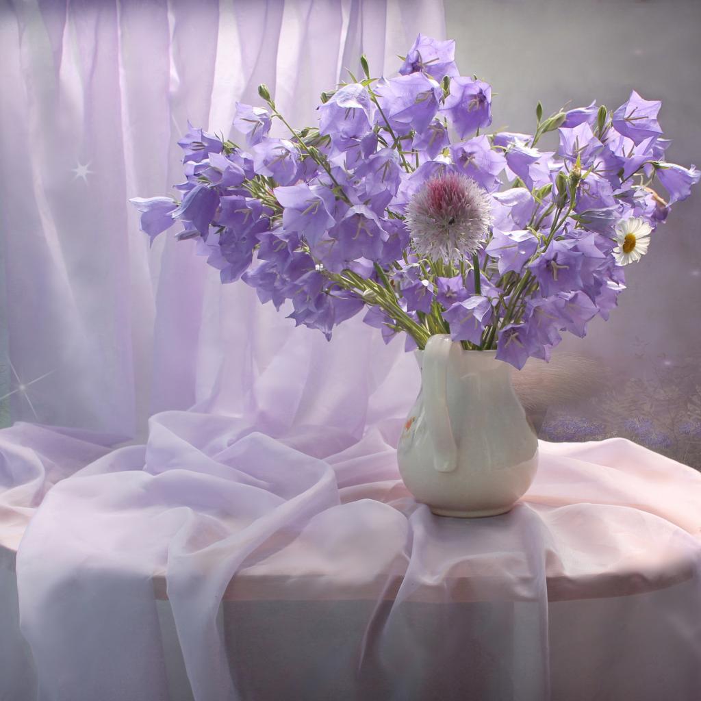 Wallpaper A bouquet of purple bells in a white vase on a table