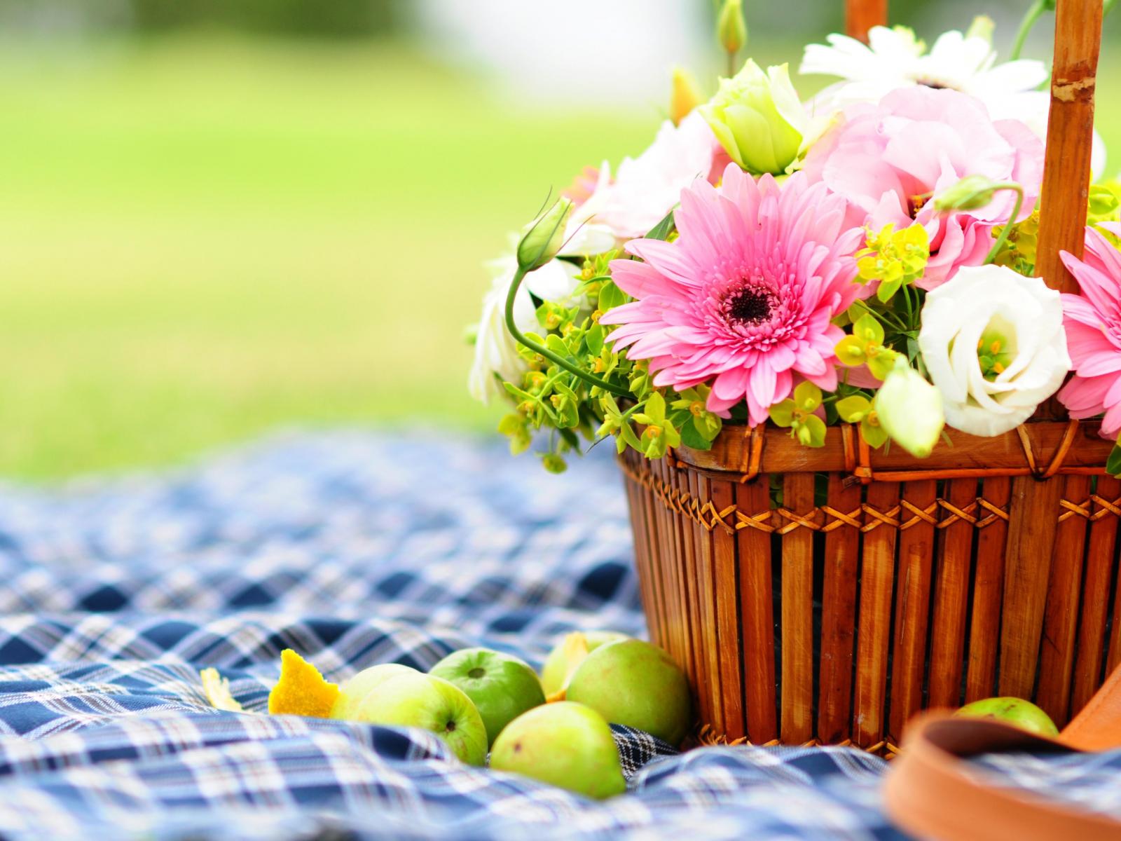 Wallpaper Bouquet of gerberas and buttercups in a basket for a picnic