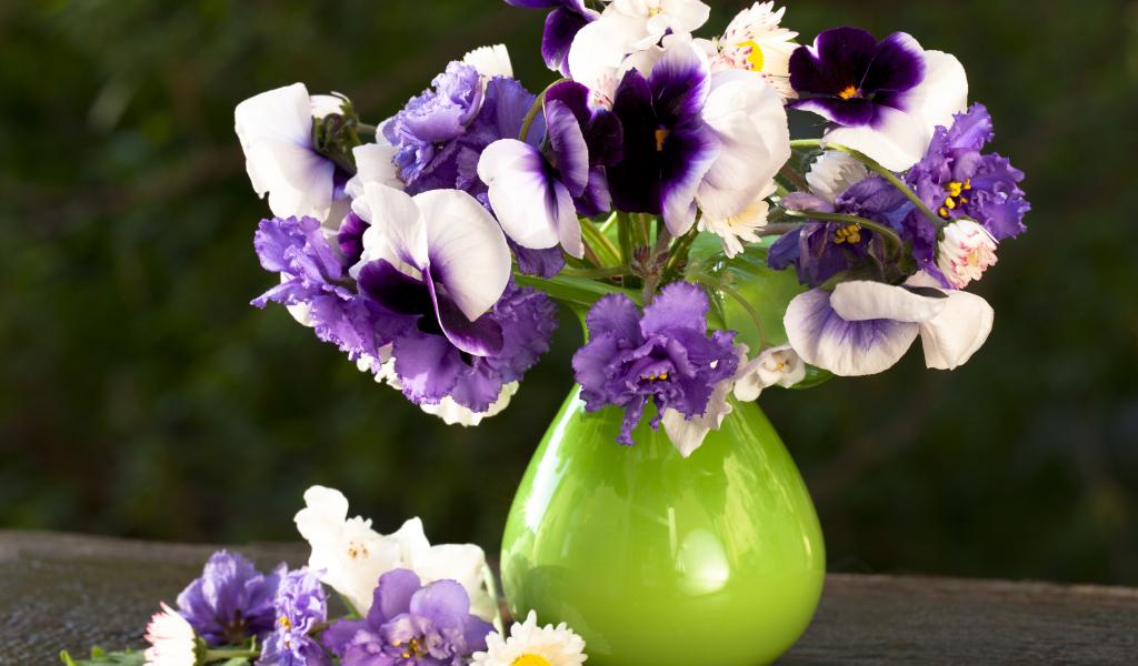 » Wallpaper A bouquet of delicate pansy flowers and violets in a vase