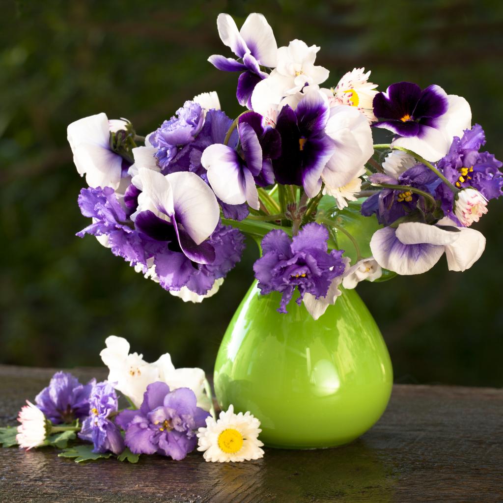 » Wallpaper A bouquet of delicate pansy flowers and violets in a vase