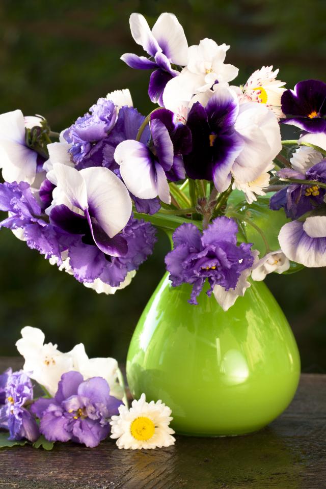 Wallpaper A bouquet of delicate pansy flowers and violets in a vase