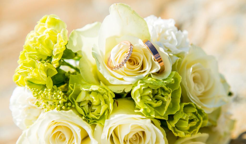 Wallpaper Bouquet of white roses with carnations and wedding rings