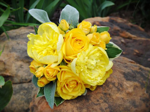 Wallpaper A bouquet of yellow roses with yellow peonies lies on a rock