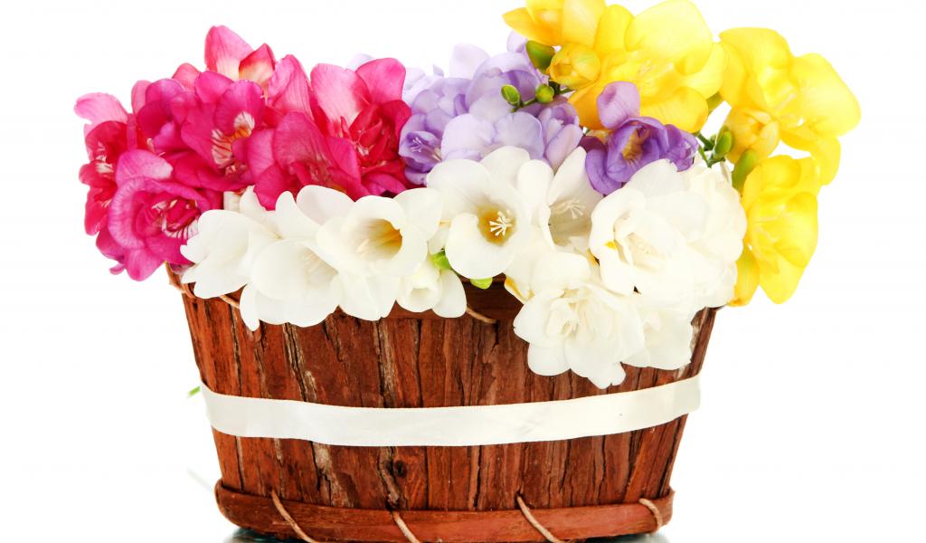 Wallpaper Basket of colorful flowers Freesia on a white background