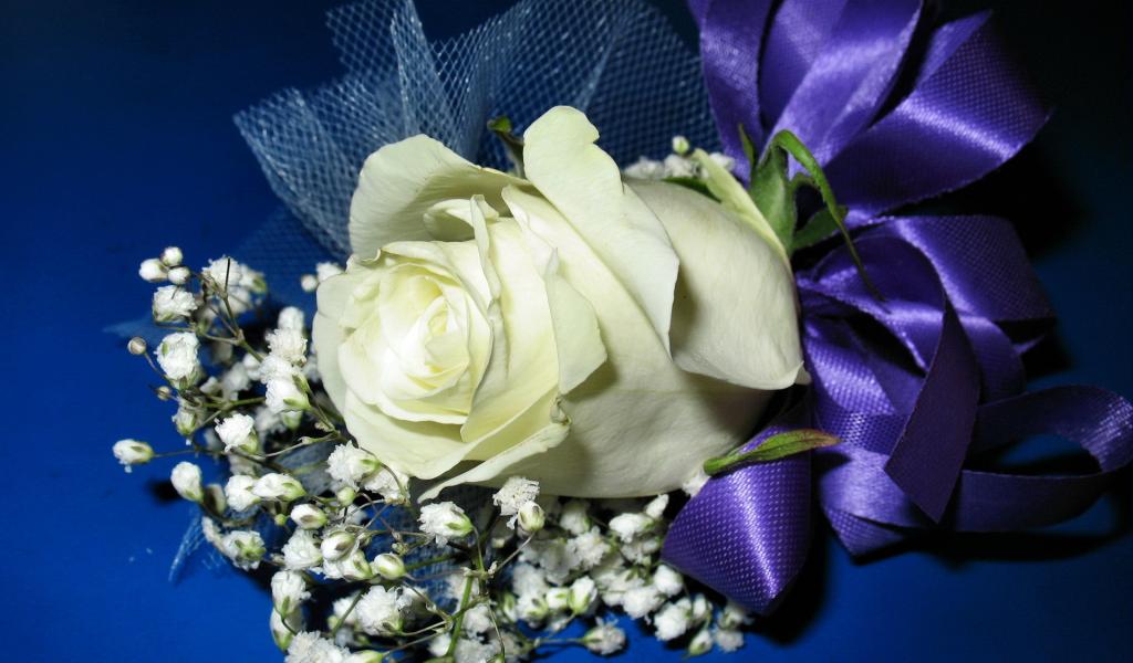 Wallpaper White rose with gypsophila bandaged with purple ribbon