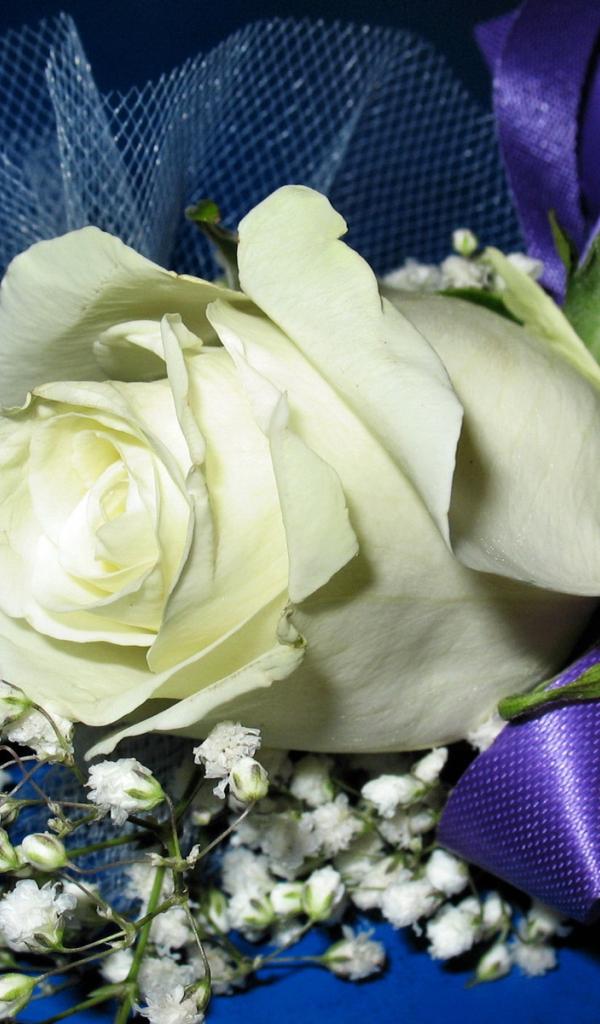 Wallpaper White rose with gypsophila bandaged with purple ribbon